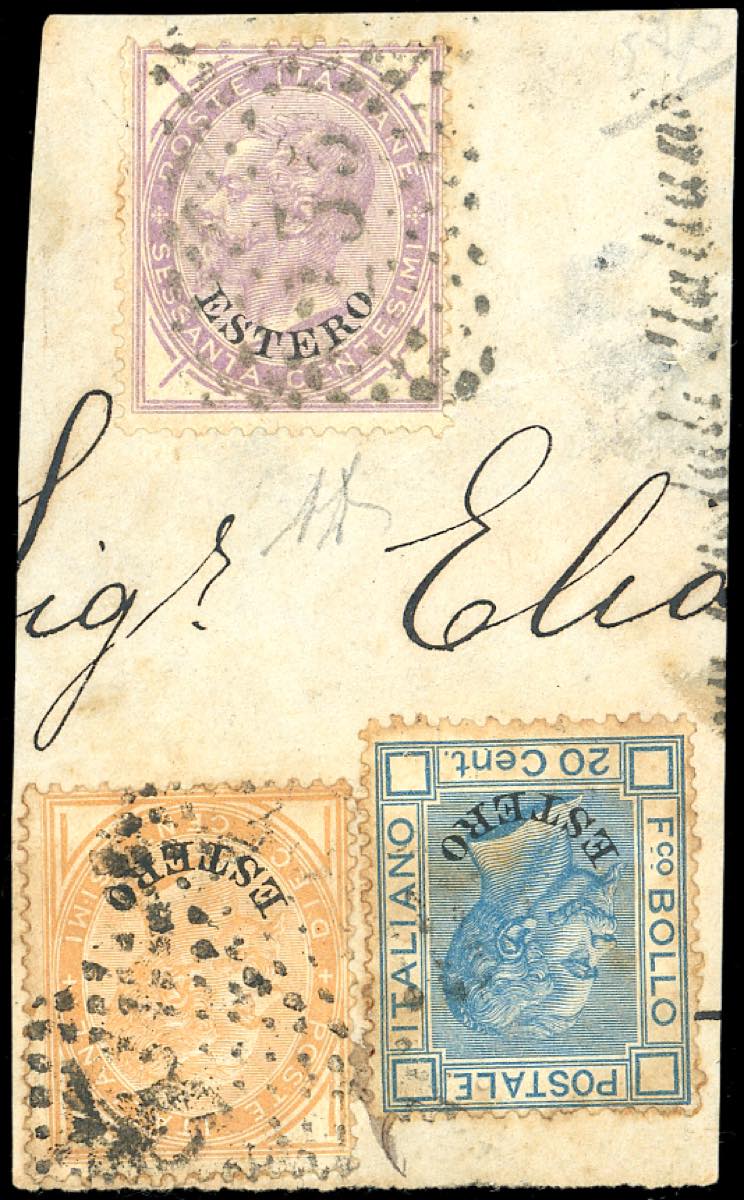 TUNISI 1874 - 10 cent., 20 cent., 60 cent. soprastampati (4,5,8), usati, su frammento con il numerale a punti "235". Rara affrancatura ... Leggi tutto