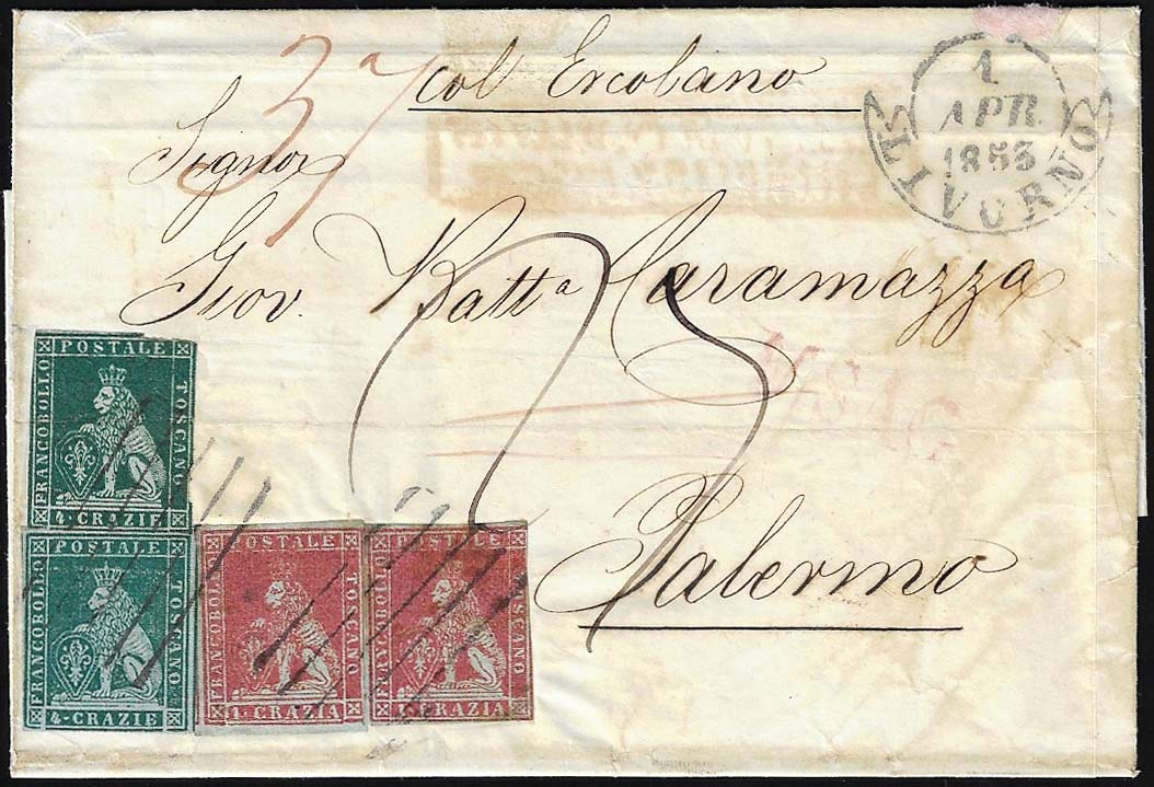 1853 - 4 crazie verde azzurro su azzurro, 4 crazie verde su grigio, 1 crazia carminio su grigio (6a,6,4d), difetti di marginatura, su sovracoperta di lettera da Livorno 1/4/1853 a Palermo, tassata 27 grana, bollo della via di mare. Interessante e rara combinazione di valori gemelli!