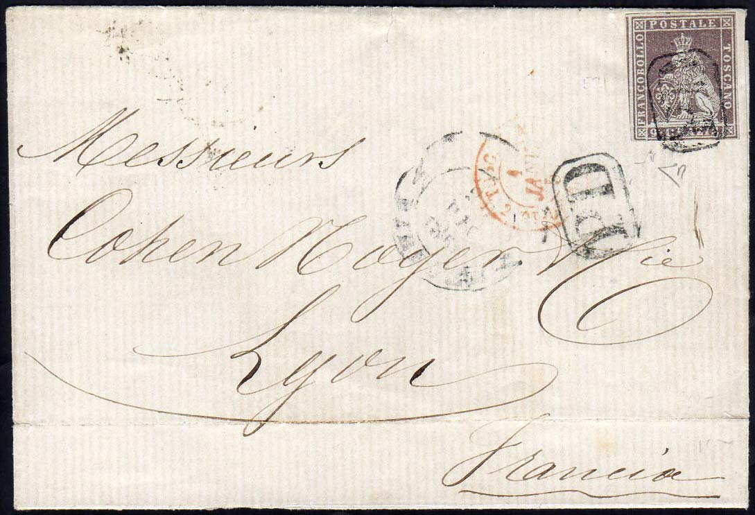 1856 - 9 crazie bruno violaceo su grigio (8), perfetto e ben marginato, su sovracoperta di lettera da Firenze 28/12/1859 a Parigi. Bella! E.Diena, Fiecchi.