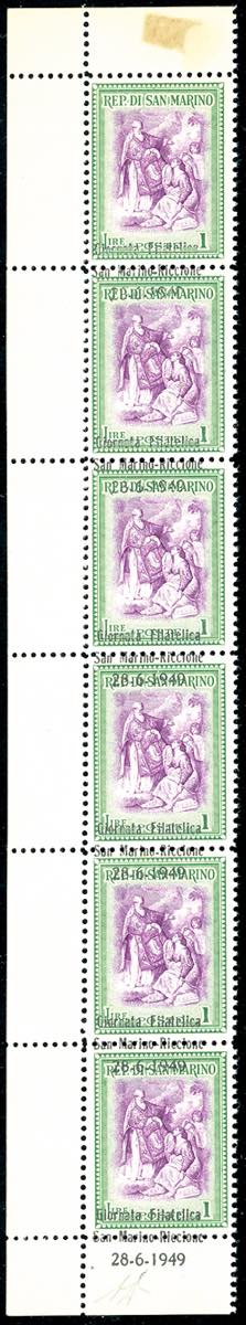 1947 - 1 lira Giornata Filatelica, striscia verticale di sei, un esemplare senza soprastampa, tre con soprastampa fortemente spostata in ... Leggi tutto