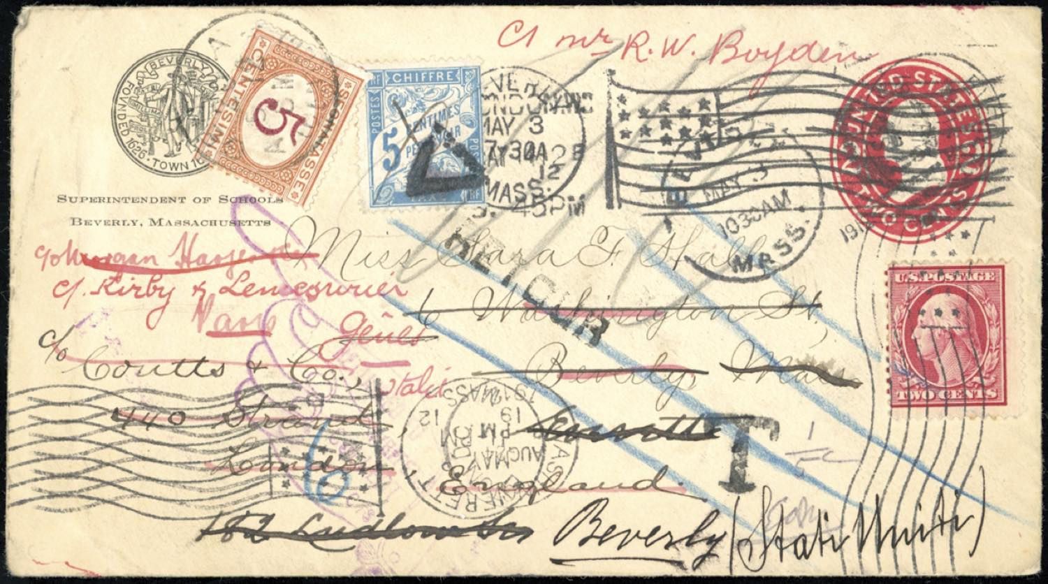 STATI UNITI D'AMERICA/GRAN BRETAGNA/FRANCIA/ITALIA 1912 - Redirected three times, with postage due. Rare.