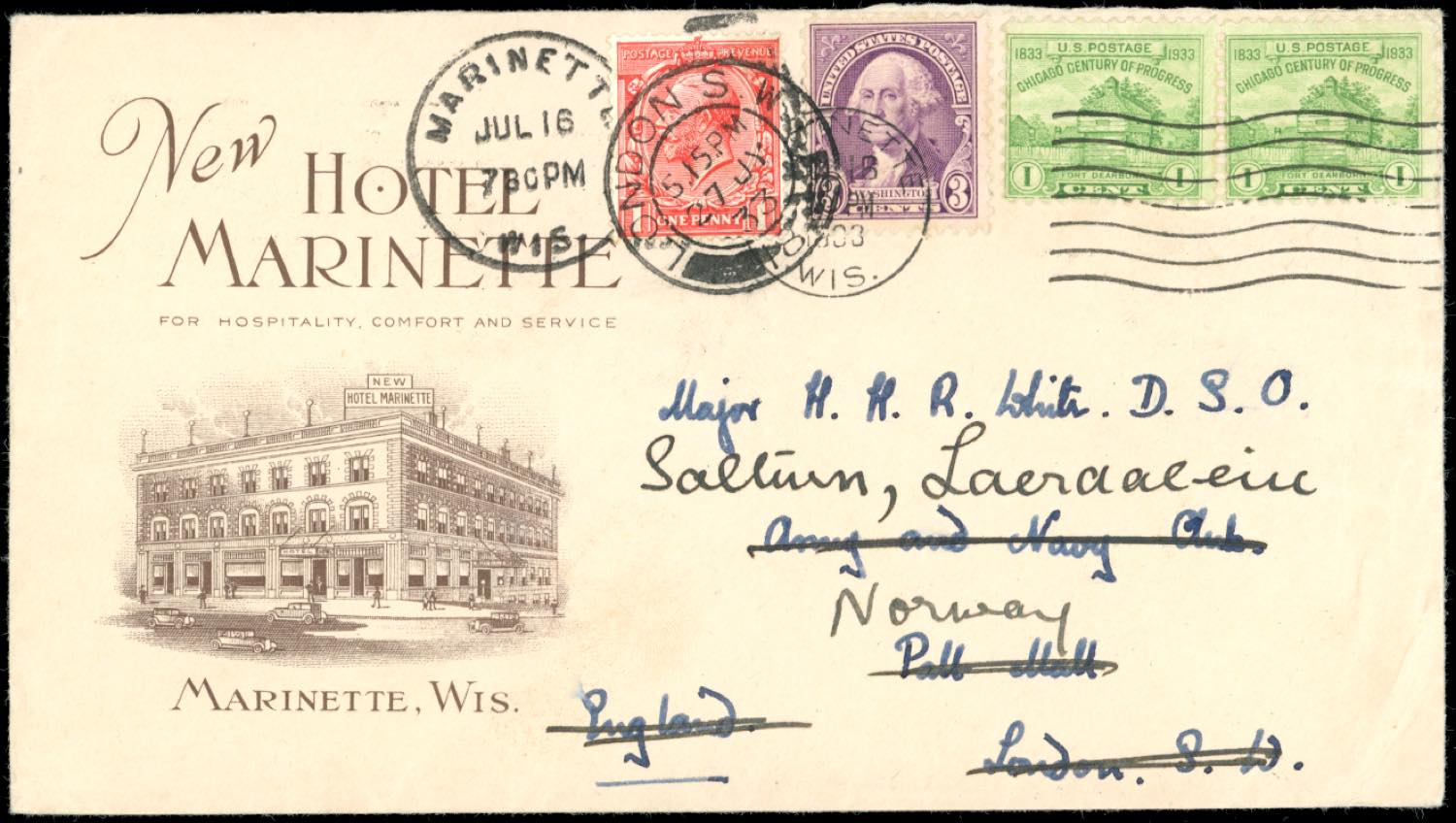 STATI UNITI D'AMERICA/GRAN BRETAGNA/NORVEGIA 1933 - Redirected with additional franking.