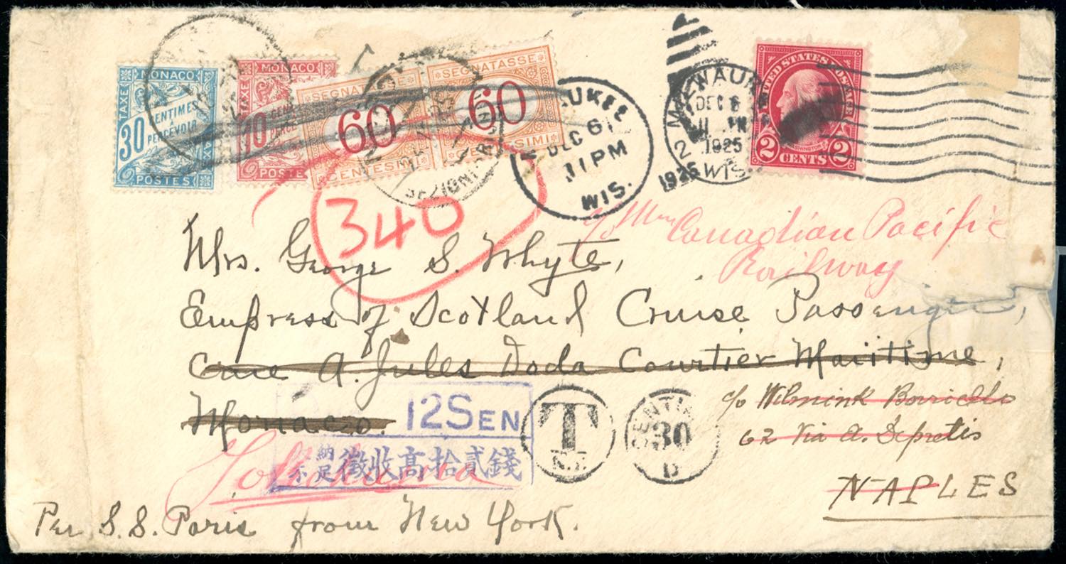 STATI UNITI D'AMERICA/MONACO/ITALIA/GIAPPONE 1925 - Redirected two times, with postage due. Rare.