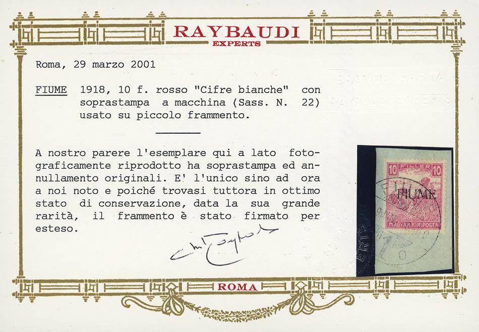 1918 - 10 f. Mietitori, cifre bianche, soprastampa a macchina (22), perfetto, usato su frammento. Raro e molto bello. Cert. Oro Raybaudi.