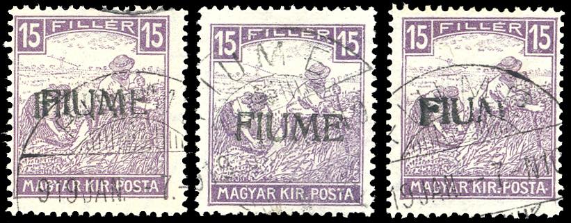 1918 - 15 f. Mietitori, cifre bianche, soprastampa a mano del II tipo, un esemplare con doppia soprastampa, uno con doppia lettera "F", varietà non catalogata per questo valore, uno con soprastampa "FIUM" (23/IIc,23/II,23/IIp), usati, perfetti. Il primo G.Oliva, il secondo Raybaudi, il terzo Ferrario.