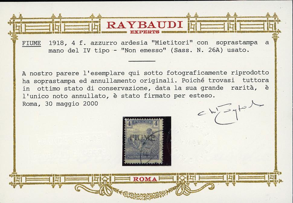 1918 - 4 f. azzurro ardesia Mietitori, soprastampa a mano del IV tipo, non emesso (26A/IV), usato, perfetto. Estremamente raro, due esemplari nuovi noti, questo è l'UNICO CONOSCIUTO USATO. Uno dei francobolli più importanti della collezione di Fiume. G.Avanzo, cert. Oro Raybaudi.