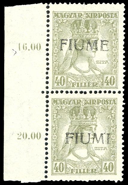 1918 - 40 f. Zita, soprastampa a mano del IV tipo, coppia verticale, l'esemplare inferiore con varietà "FIUMI" invece di "FIUME" (26/IVn), ... Leggi tutto