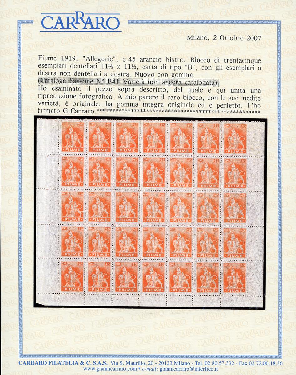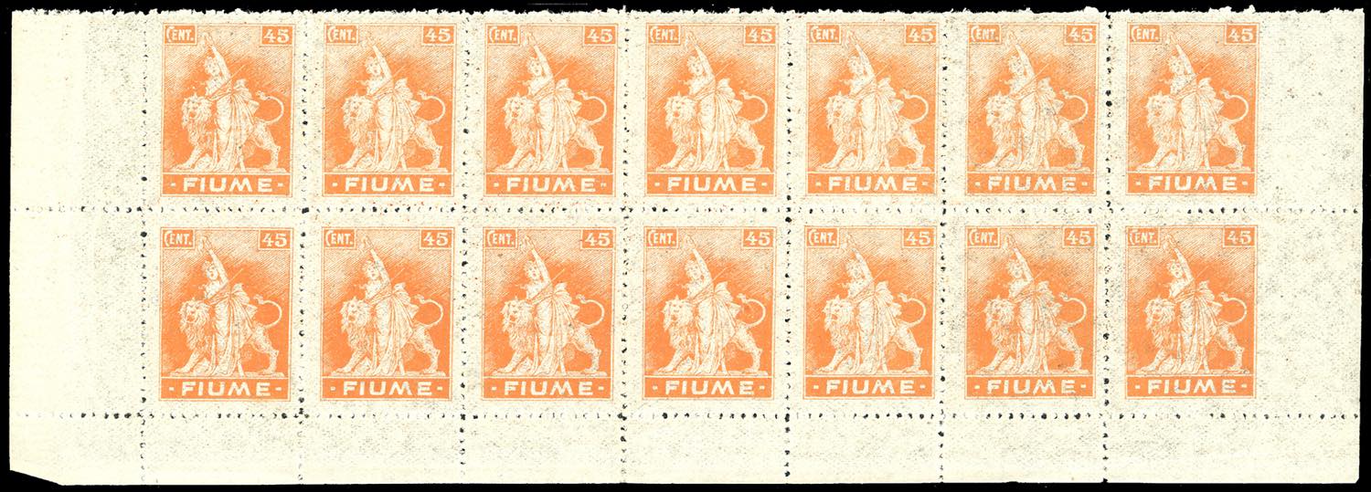 1919 - 45 cent. Allegorie e Vedute, carta B, blocco di 14 esemplari, gli ultimi due non dentellati a destra (B41f), angolo di foglio, gomma originale integra, perfetto e molto fresco. Raro. Cert. Carraro del blocco di provenienza.