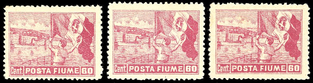 1919 - 60 cent. Posta Fiume, un esemplare dent. 12 1/4 x 12 1/2 x 12 3/4 x 13, uno dent. 12 1/4 x 12 1/2, uno dent. 13 (55/Iab,55/I,55/Ic), gomma originale, integra per il terzo, perfetti. Insieme non comune. Due cert. Oro Raybaufi e uno Sorani.