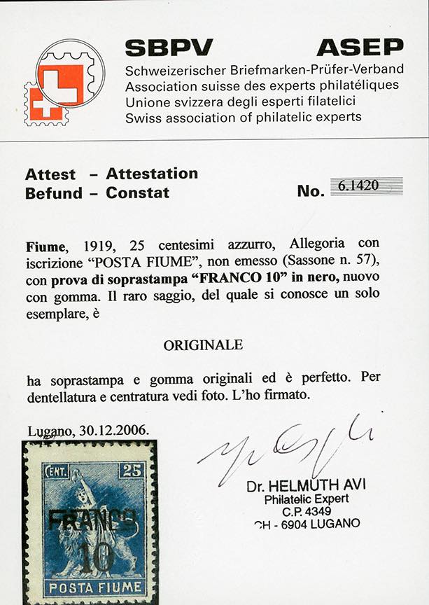 1919/20 - 10 cent. su 25 cent. Posta Fiume, soprastampato "FRANCO", errore di soprastampa (D77A), gomma originale, perfetto. Si tratta dell'UNICO ESEMPLARE NOTO, rarità dell'emissione. Cert. Avi.