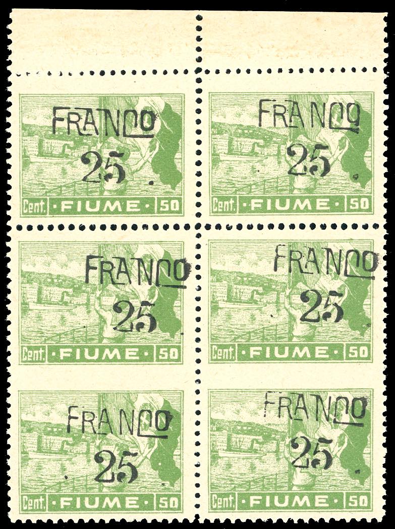 1919/20 - 25 cent. su 50 cent. soprastampati "FRANCO", carta C, blocco di sei contenente due coppie verticali non dentellate al centro ... Leggi tutto