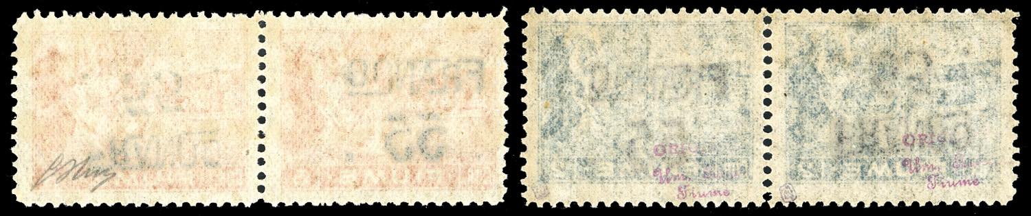 1919/20 - 55 cent. su 2 cor. e 55 cent. su 3 cor. soprastampati "FRANCO", carta B, coppie orizzontali con un esemplare con stampa capovolta (B84ab,B85ab), gomma originale integra, perfette. Molto rare. G.Oliva per la seconda.