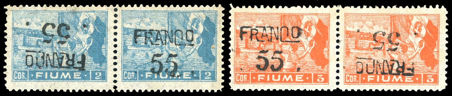 1919/20 - 55 cent. su 2 cor. e 55 cent. su 3 cor. soprastampati "FRANCO", carta B, coppie orizzontali con un esemplare con stampa capovolta ... Leggi tutto
