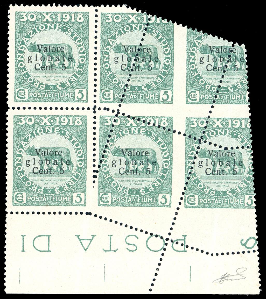 1919 - 5 cent. su 5 cent. soprastampato "Valore globale" (88), blocco di quattro con bella ed evidente varietà di dentellatura causata da ... Leggi tutto