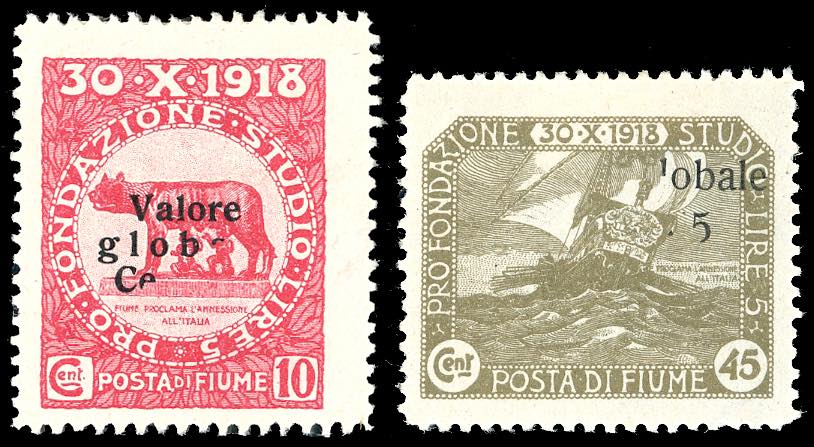1920 - 20 cent. su 20 cent. e 45 cent. su 45 cent. soprastampati "Valore globale" (100,104), entrambi con soprastampa parziale, gomma originale, perfetti . Varietà non catalogate.