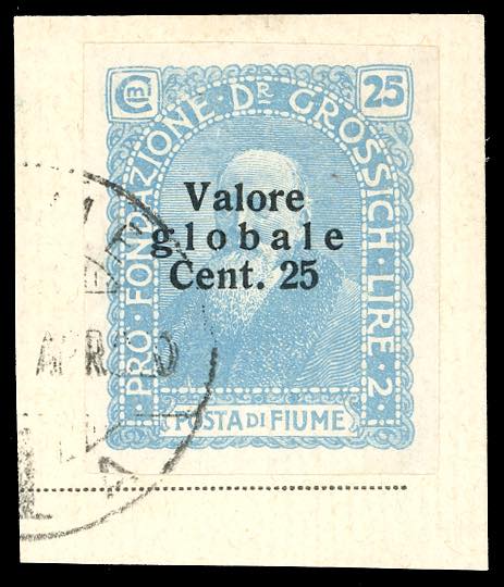 1920 - 25 cent. su 25 cent. celeste latteo soprastampato "Valore globale", non dentellato (103abl), perfetto, usato su frammento. Molto raro.
