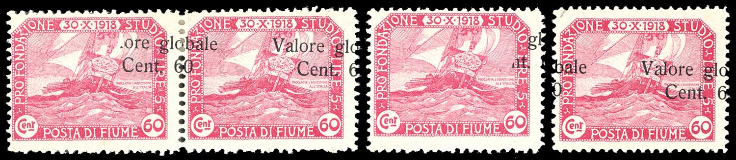 1919 - 60 cent. su 60 cent. soprastampato "Valore globale" (105), due esemplari e una coppia, tutti con soprastampa incompleta e/o a cavallo, gomma originale, perfetti. Interessanti varietà, non catalogate.