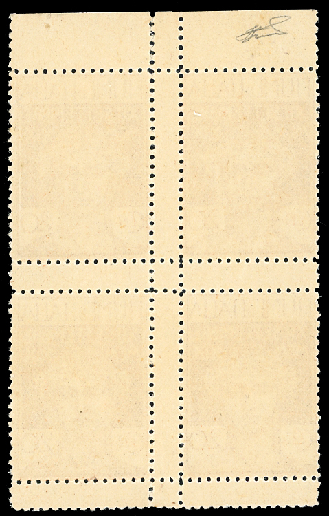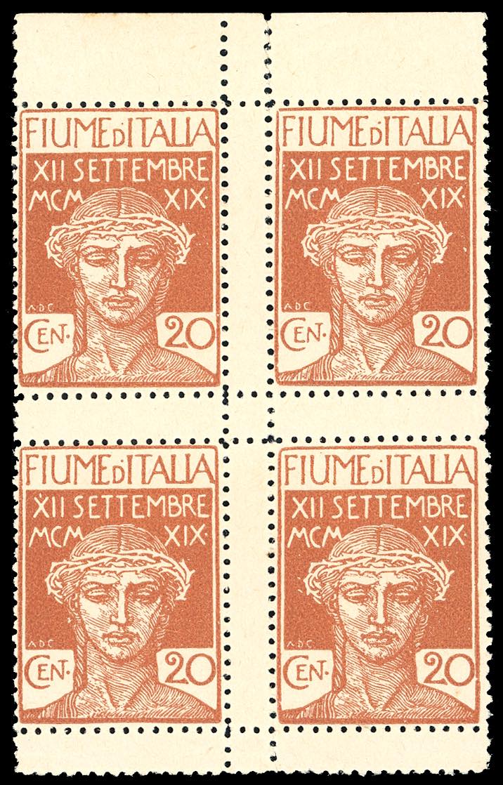 1920 - 20 cent. Legionari, dicitura "FIUME D'ITALIA" (129, vedi riquadro), blocco di quattro con doppia dentellatura al centro, bordo di foglio in alto, gomma originale integra, perfetto. UNICO NOTO, citato del cat. Sassone. Grande rarità. Cert. Ferrario.