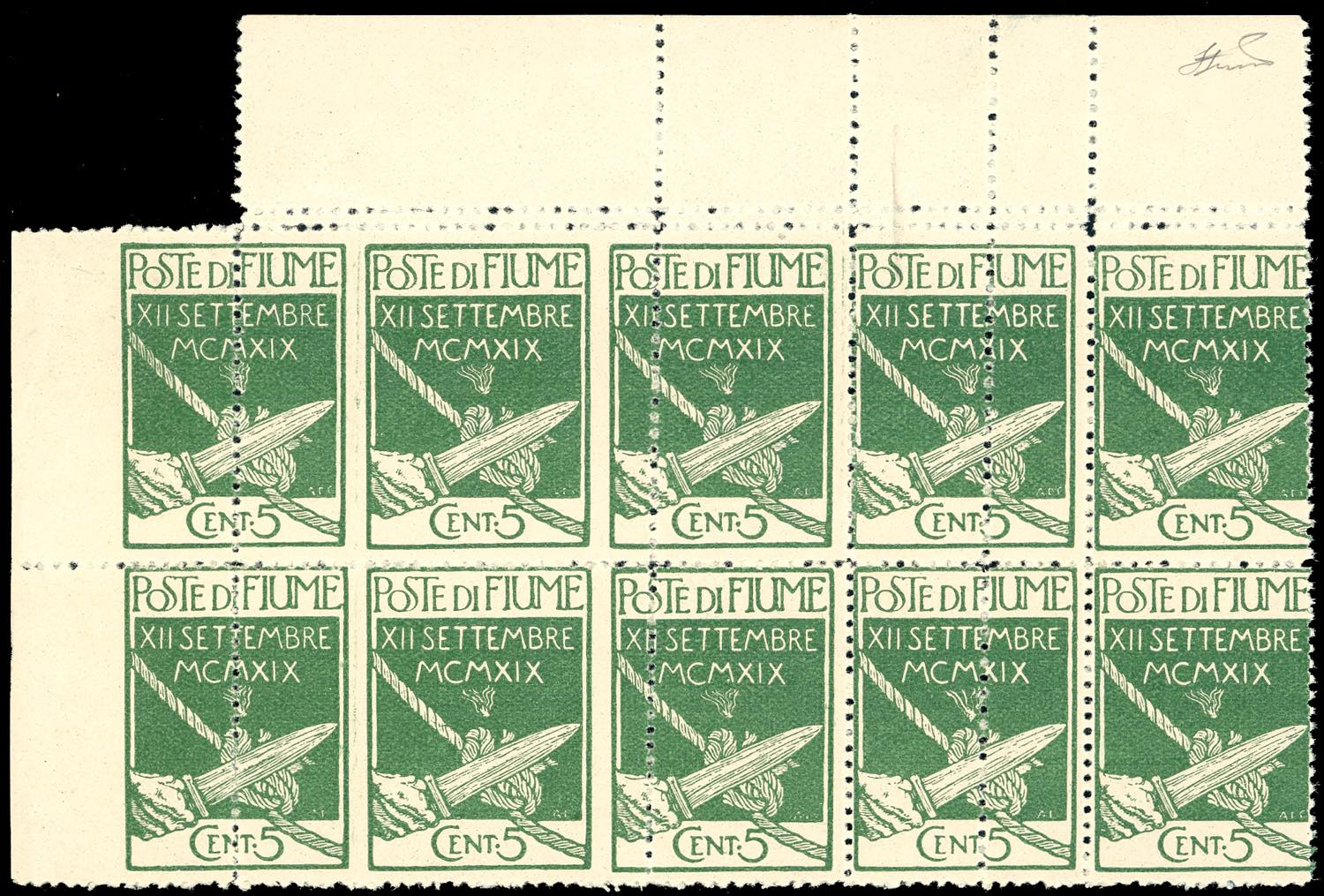 1920 - 5 cent. Legionari, blocco di dieci esemplari contenente le varietà di dentellatura n. 127gc, 127gd, 127i, 127k, angolo di foglio, ... Leggi tutto