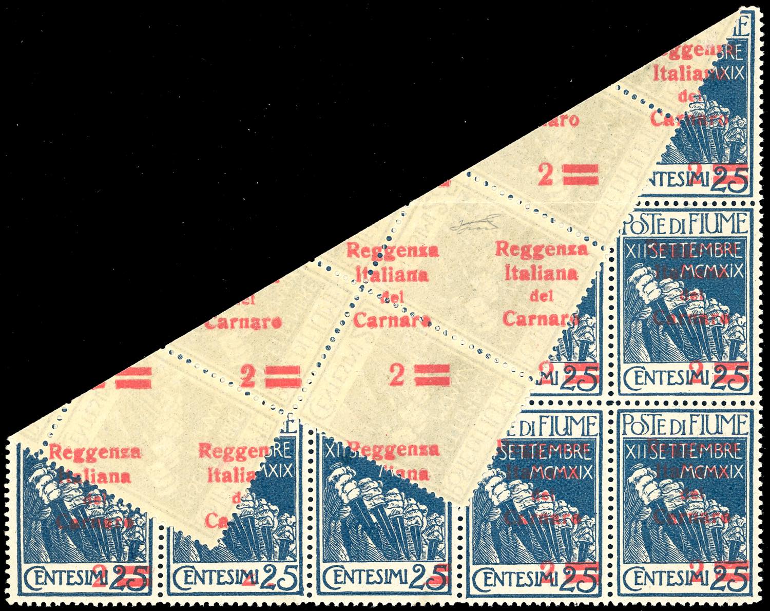 1920 - 2 cent. su 25 cent. soprastampato "Reggenza Italiana del Carnaro", blocco di 15 esemplari, in parte con la soprastampa solo al verso, in parte con la soprastampa recto-verso (132s,132sa), gomma originale integra, un solo esemplare linguellato, perfetto. Varietà di grande impatto visivo, originata dall'accidentale piegatura del foglio al momento della soprastampa. Ferrario.