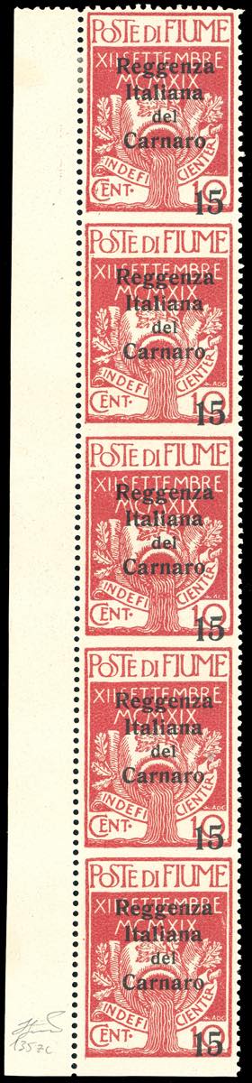 1920 - 15 cent. su 10 cent. soprastampato "Reggenza Italiana del Carnaro", striscia orizzontale di cinque non dentellata orizzontalmente e ... Leggi tutto
