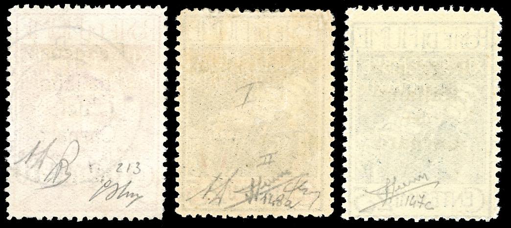 1920 - Soprastampati "Reggenza Italiana del Carnaro", i tre valori senza l'emblema della Reggenza al verso (147c,148c,146Ac), il primo gomma originale integra, il secondo con leggera traccia di linguella, il terzo usato. Raro insieme. Sorani per il primo, A.Diena e Sorani per il secondo, G.Oliva e A.Diena per il terzo.
