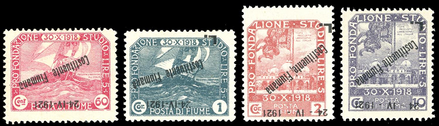 1921 - 60 cent., 1 lira, 2 lire e 10 lire soprastampati "Costituente Fiumana", tutti con soprastampa capovolta (169a,171a,172a,175a), gomma originale, perfetti.