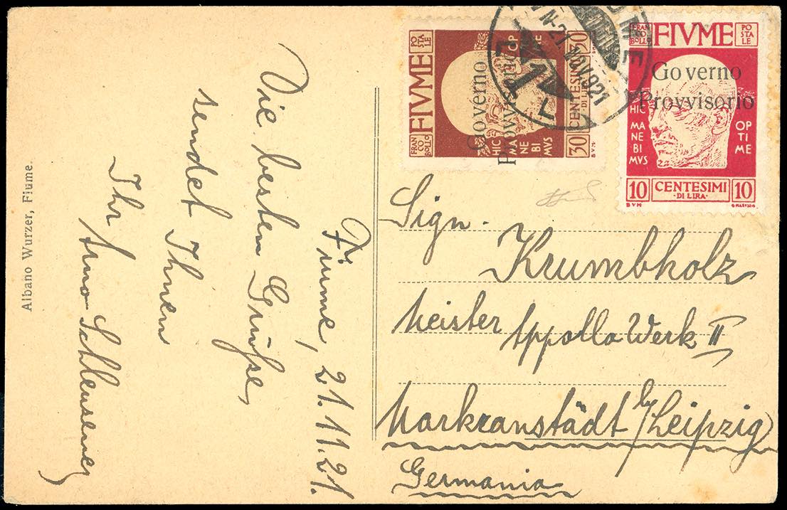 1921 - 10 cent. soprastampato "Governo Provvisorio", senza trattino in basso, 30 cent. soprastampato (176,154), perfetti, su cartolina da Fiume 21/11/1921 per la Germania. Ferrario.
