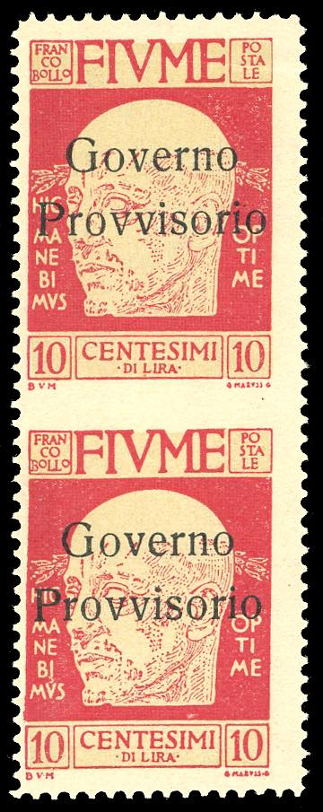 1921 - 10 cent. soprastampato "Governo Provvisorio", senza trattino in basso, tiratura di Milano, coppia verticale non dentellata al centro (178ab), gomma originale integra, lieve grinza orizzontale. Fiecchi.
