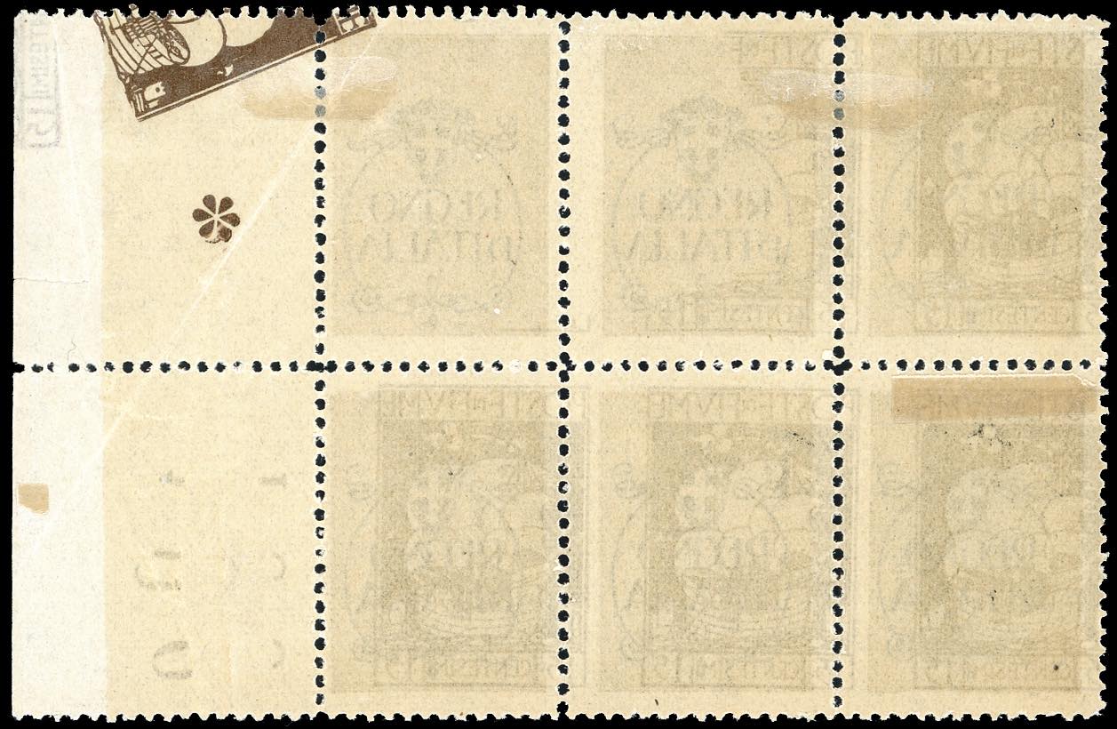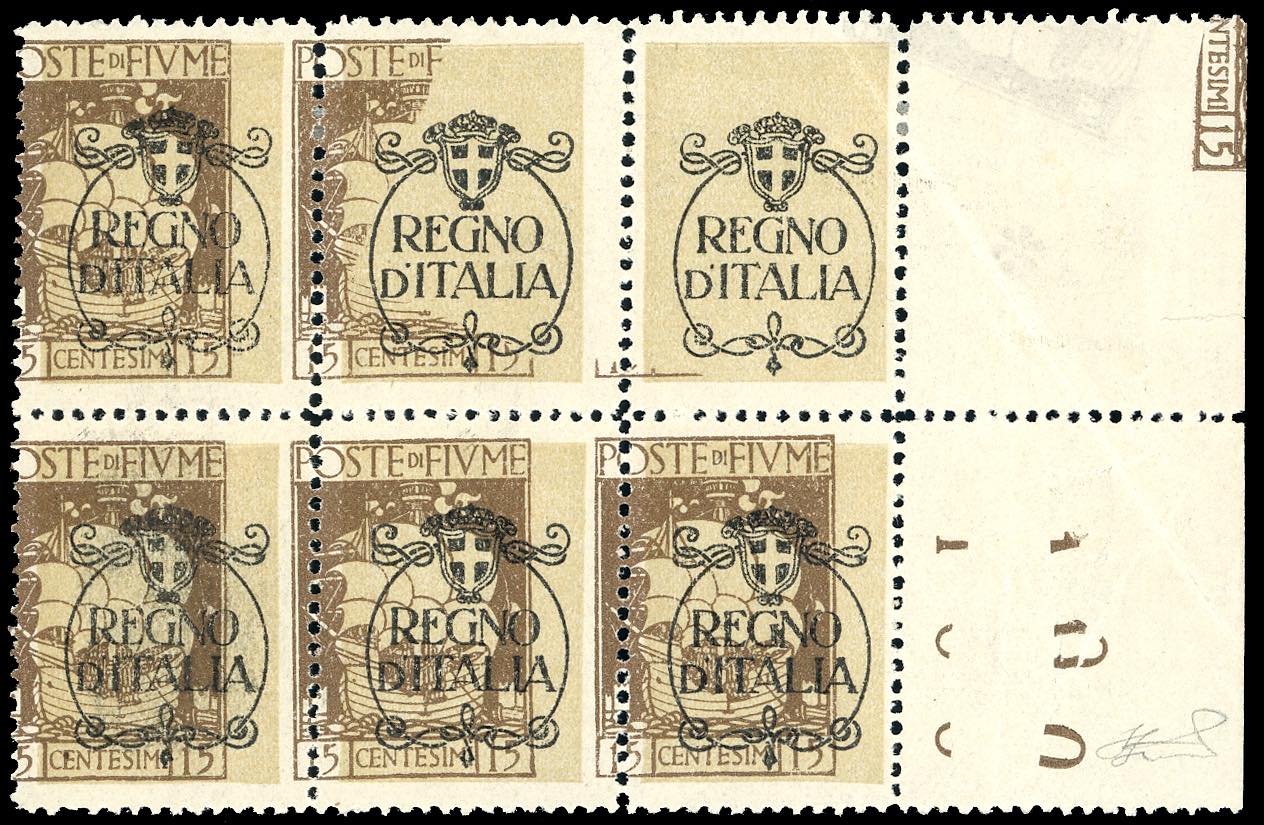 1924 - 15 cent. soprastampato "Regno d'Italia", blocco di sei esemplari, uno con la stampa del francobollo totalmente mancante, uno con ... Leggi tutto