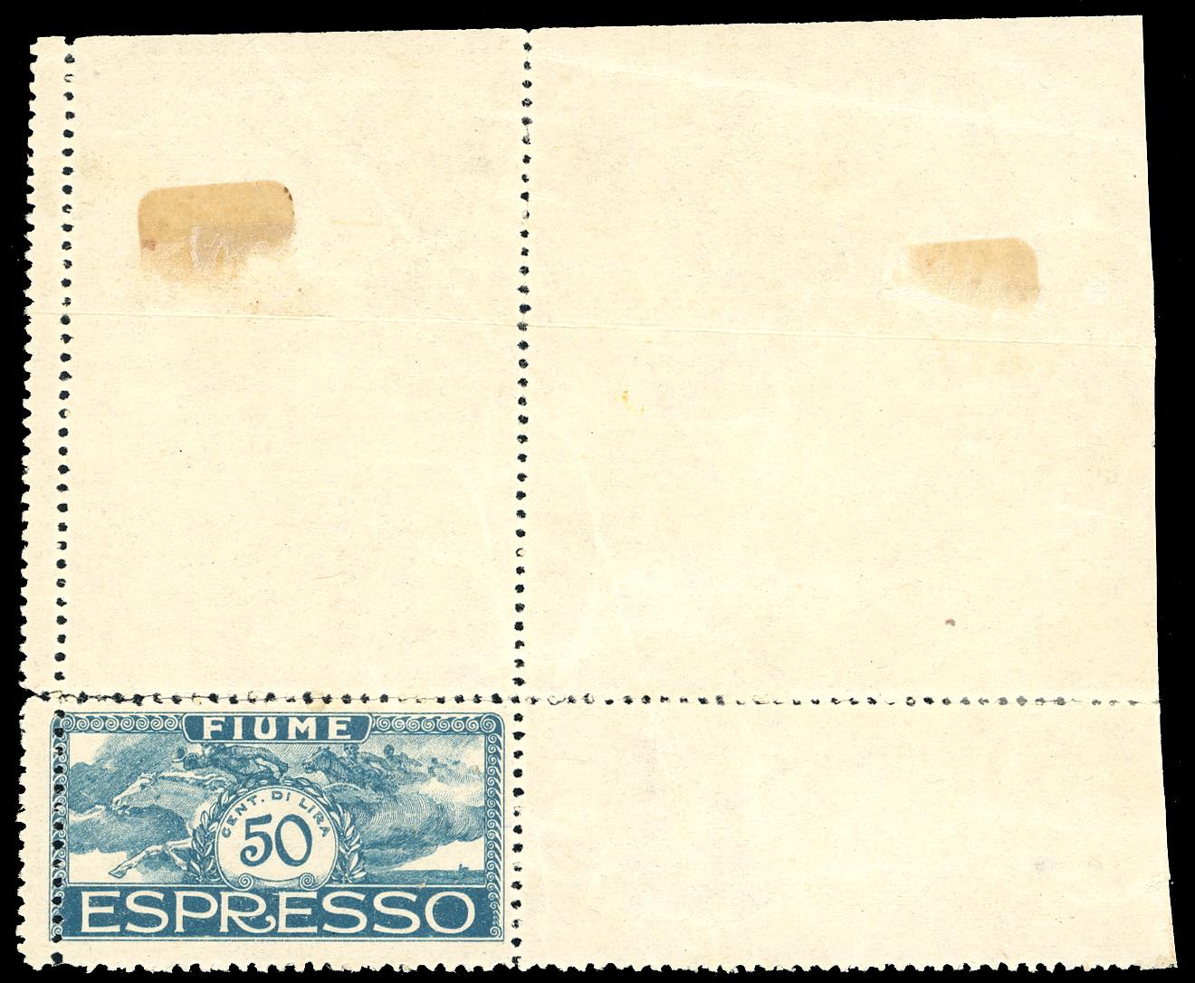 1920 - 50 cent. azzurro verdastro, errore di colore, doppia dentellatura verticale (2At), angolo di foglio, dentellatura parzialmente ... Leggi tutto