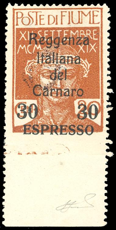 1920 - 30 cent. su 20 cent. soprastampato "Reggenza Italiana del Carnaro", non dentellato in basso (3e), bordo di foglio, gomma originale, leggera traccia di linguella, perfetto. G.Oliva.
