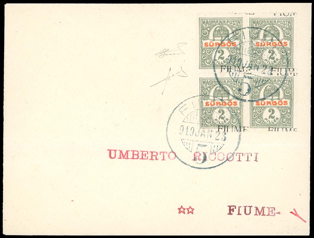 1919 - 2 f. oliva e rosso soprastampato a macchina, soprastampa obliqua (2e), blocco di quattro esemplari, perfetto, su busta da Fiume 23/1/1919 per città. Fiecchi, Ferrario.
