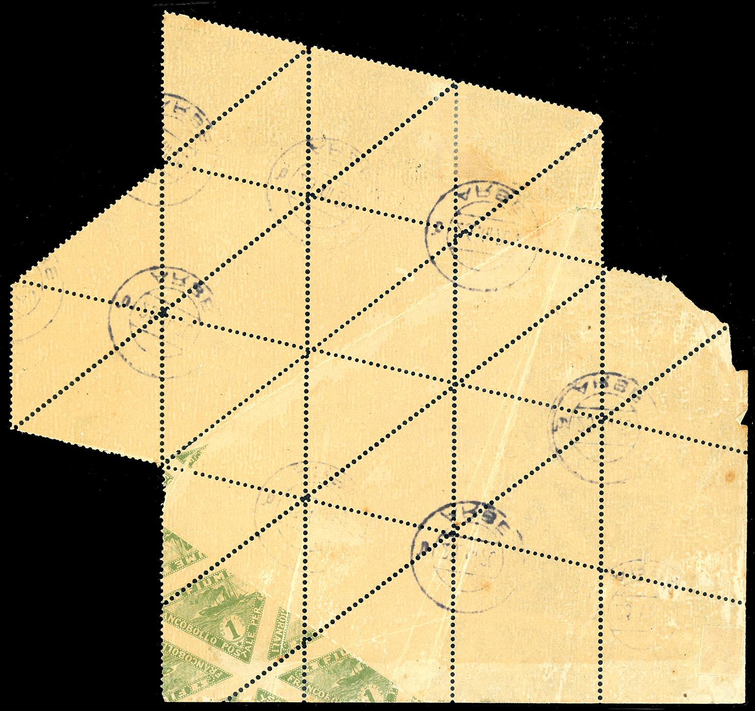 1920 - 1 cent. Nave, carta giallastra, eccezionale blocco di 23 francobolli comprendenti dodici esemplari della varietà 5Adaa, otto della varietà 5Adb e tre della varietà 5Adc, usato ad Arbe, ottimo stato. Insieme spettacolare e probabilmente unico, causato da un'anomala piegatura del foglio in fase di stampa (parte dei francobolli sono stampati al verso).