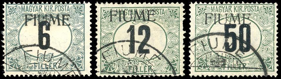 1918/19 - Soprastampati a macchina, filigrana C, serie completa con soprastampa fortemente spostata in alto (C1c,C2c,C3c), usati, perfetti, ad eccezione del 12 f. che ha un piccolo difetto di dentellatura. Raybaudi per il primo.