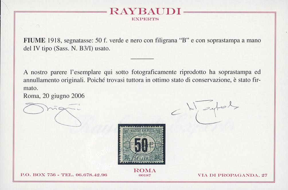 1918/19 - 50 f., filigrana B, soprastampa a mano del IV tipo (B3/IV), usato, perfetto. Raro. G.Oliva, cert. Raybaudi.