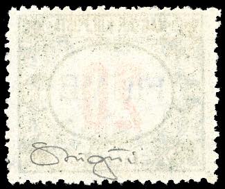 1918/19 - 20 f. cifre rosse, soprastampa a mano del III tipo (11/III), usato, perfetto. UNICO ESEMPLARE NOTO con questo tipo di ... Leggi tutto