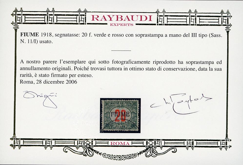1918/19 - 20 f. cifre rosse, soprastampa a mano del III tipo (11/III), usato, perfetto. UNICO ESEMPLARE NOTO con questo tipo di sovrastampa. Cert. Oro Raybaudi.