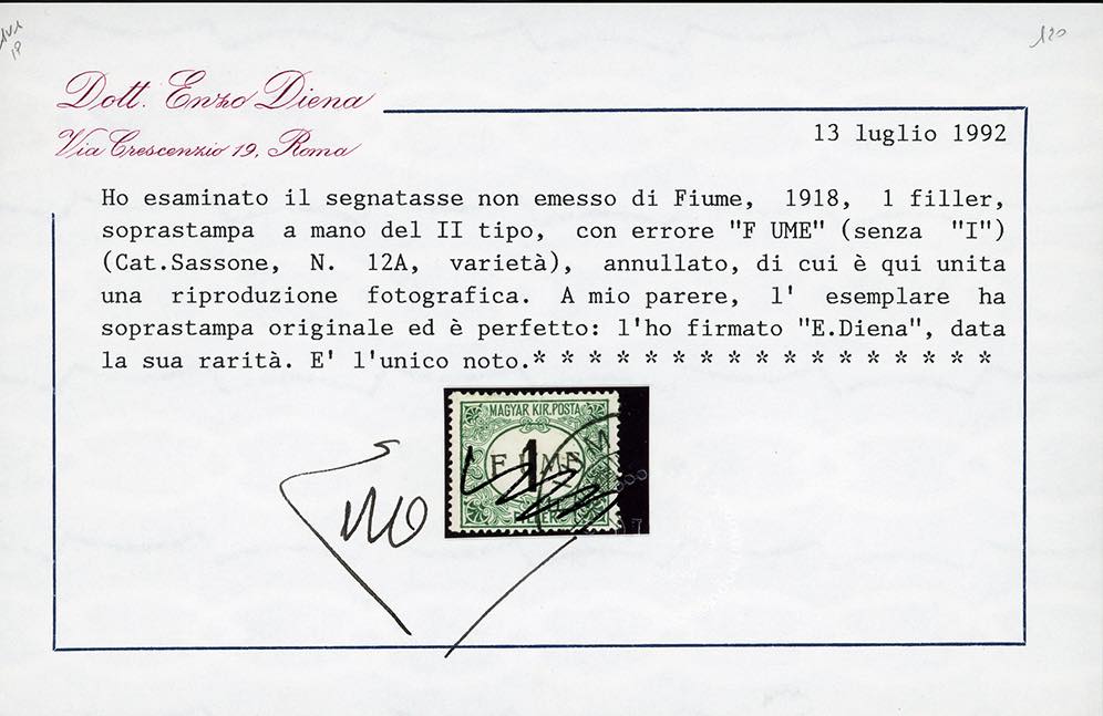 1918/19 - 1 f. verde e nero, soprastampa a mano del II tipo, non emesso, varietà "F UME" (12Ab), usato, perfetto. Si tratta dell'UNICO ESEMPLARE NOTO, una delle maggiori rarità della collezione di Fiume. R.Mondolfo, cert. E.Diena.