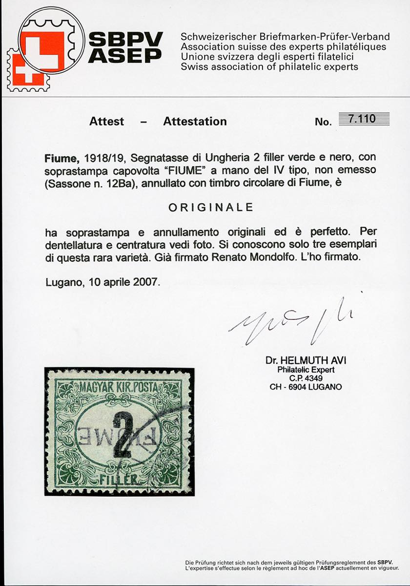 1918/19 - 1 f. verde e nero, soprastampa a mano del IV tipo, capovolta, non emesso (12Ba), usato, perfetto. Estremamente raro, SONO NOTI SOLO TRE ESEMPLARI, tutti usati. R.Mondolfo, G.Oliva, cert. Avi.