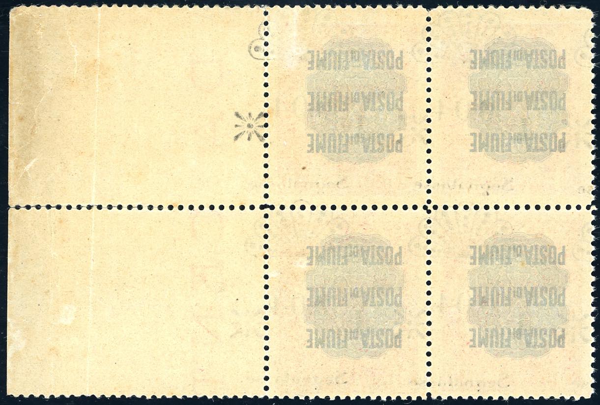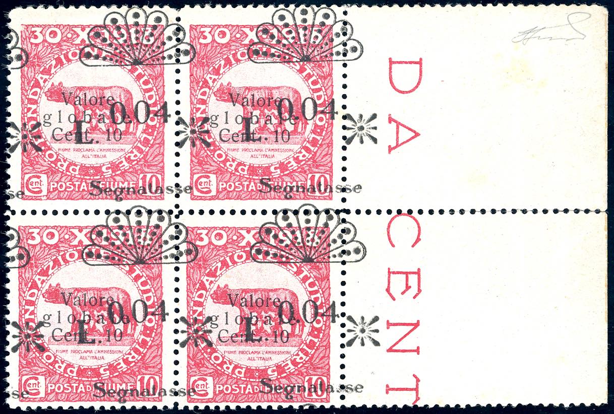 1921 - 0,04 lire su 10 cent., soprastampa obliqua e fortemente spostata in alto e a destra (16sdbc), blocco di quattro, bordo di foglio su cui è stata impressa parte della soprastampa, gomma originale integra, pefetto. Insieme molto raro. Ferrario.