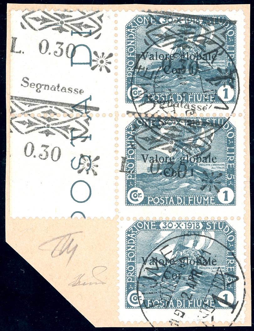 1921 - 0,30 lire su 1 cor. soprastampato, striscia verticale di tre, i primi due esemplari con soprastampa obliqua ripetuta anche sul bordo di foglio, il terzo senza soprastampa (20ua+20kac), perfetta, usata su frammento. Combinazione di varietà non catalogata, di grande impatto visivo. Ferrario.