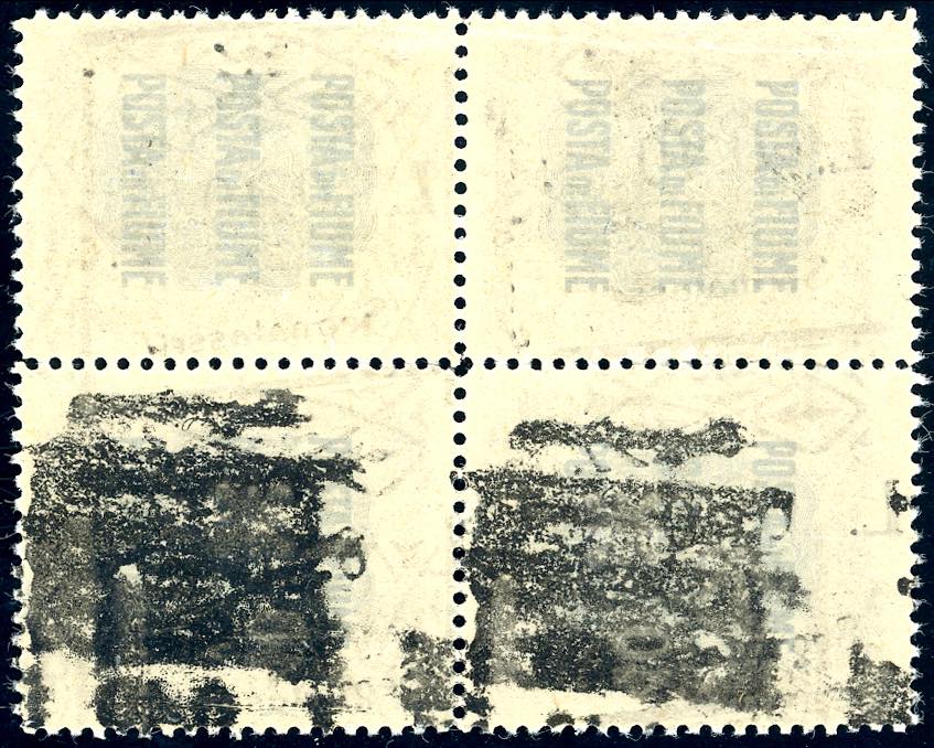 1921 - 0,40 lire su 80 cent. soprastampato, tripla soprastampa, di cui una obliqua, una evanescente e obliqua, una verticale (21ib), blocco di quattro, gomma originale integra per tre esemplari, leggerissima traccia di linguella sull'altro, ottimo stato, consuete diffuse macchie tipografiche al verso solo sui due esemplari inferiori.