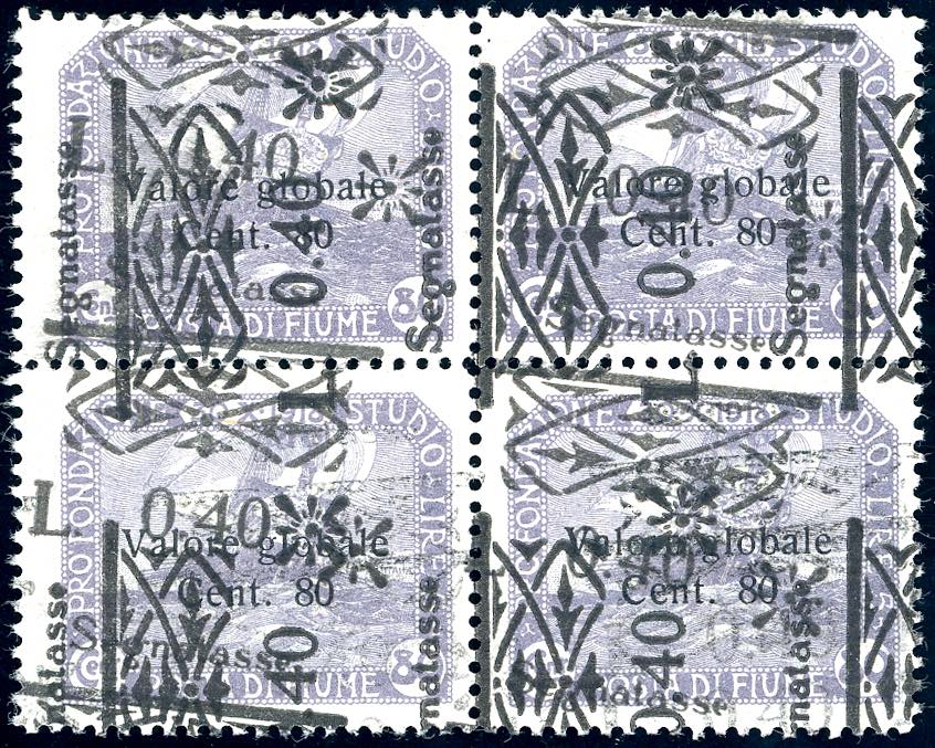 1921 - 0,40 lire su 80 cent. soprastampato, tripla soprastampa, di cui una obliqua, una evanescente e obliqua, una verticale (21ib), blocco ... Leggi tutto