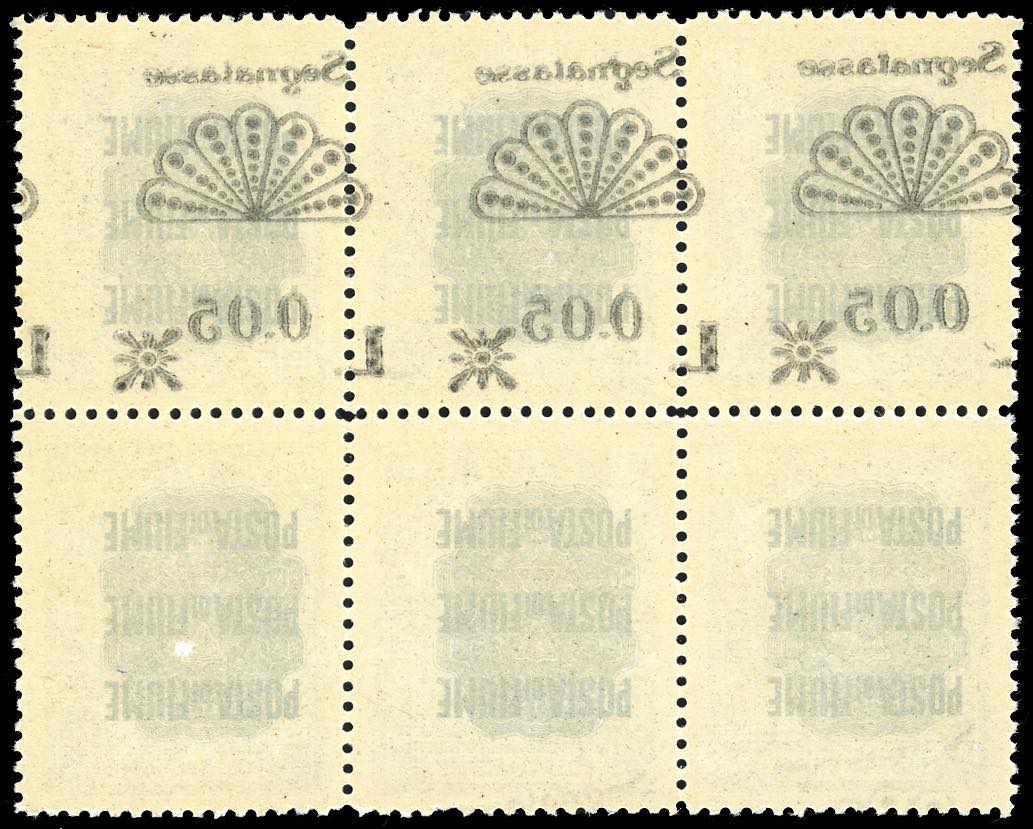 1921 - 0,05 lire su 25 cent. soprastampato, blocco di sei esemplari, quelli inferiori senza soprastampa, quelli superiori con soprastampa ... Leggi tutto