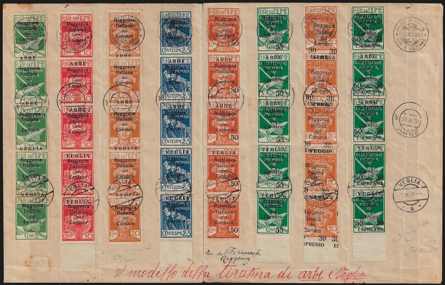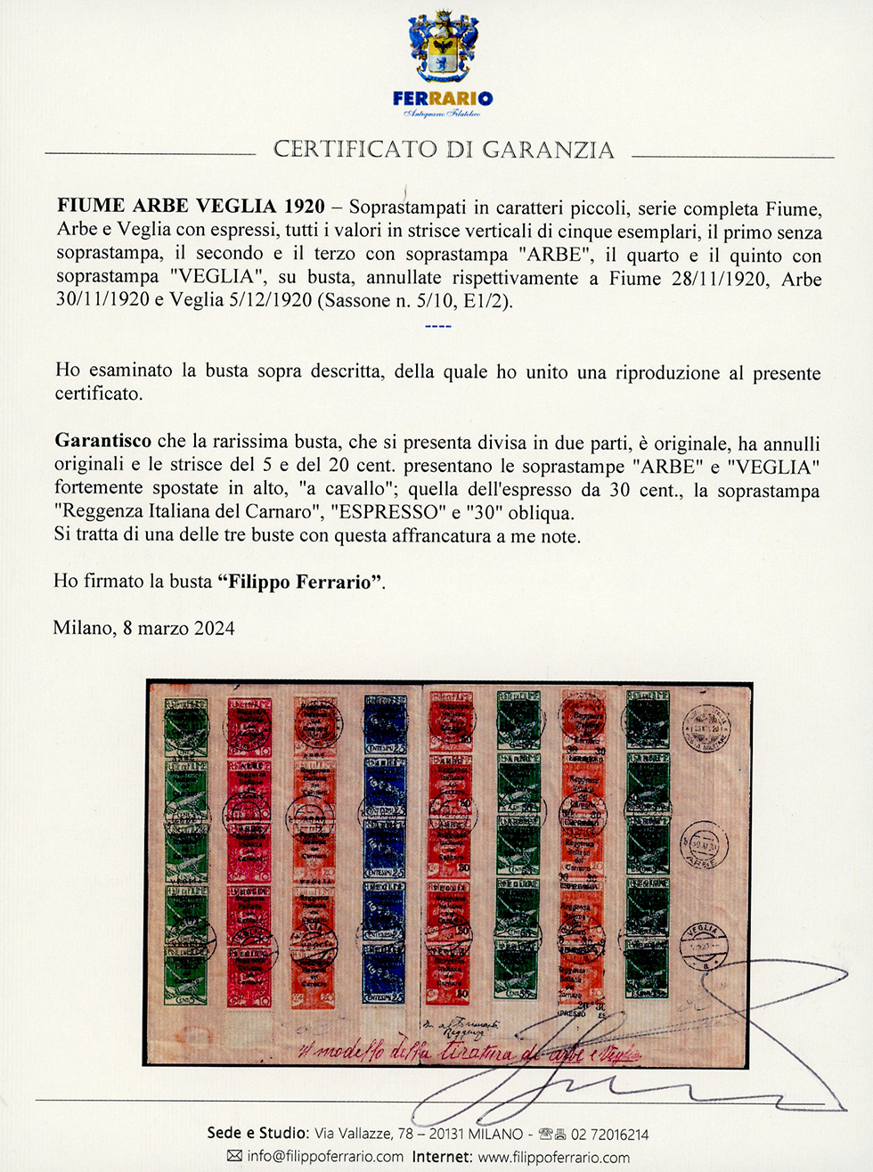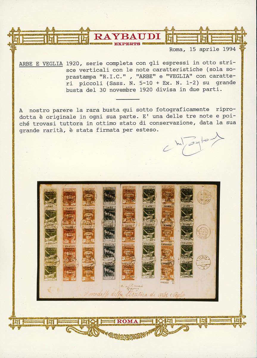 1920 - Soprastampati in caratteri piccoli, serie completa Fiume, Arbe e Veglia con espressi (5/10,E1/2), tutti i valori in strisce verticali di cinque esemplari, il primo senza soprastampa, il secondo e il terzo con soprastampa "ARBE", il quarto e il quinto con soprastampa "VEGLIA" (Sassone nota inziale), su busta di grande formato divisa in due parti, annullate rispettivamente a Fiume 28/11/1920, Arbe 30/11/1920 e Veglia 5/12/1920. Le strisce del 5 e del 20 cent. presentano le soprastampe "ARBE" e "VEGLIA" fortemente spostate in alto, "a cavallo"; quella dell'espresso da 30 cent., la soprastampa "Reggenza Italiana del Carnaro", "ESPRESSO" e "30" obliqua. UNA DELLE TRE BUSTE NOTE! Rarità assoluta del settore, di grande fascino, da esposizione. Cert. Oro Raybaudi e Ferrario.
