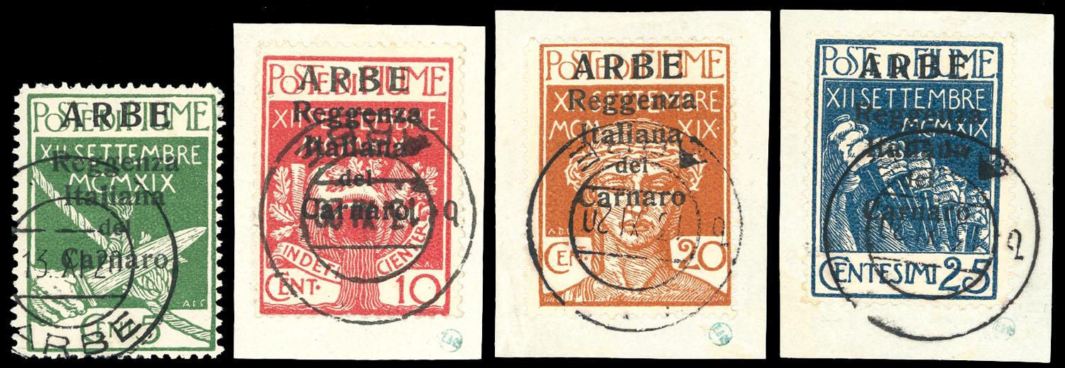 1920 - Soprastampati in caratteri grandi, serie completa (1/4), perfetti, usati, tre su frammento. Ferrario.