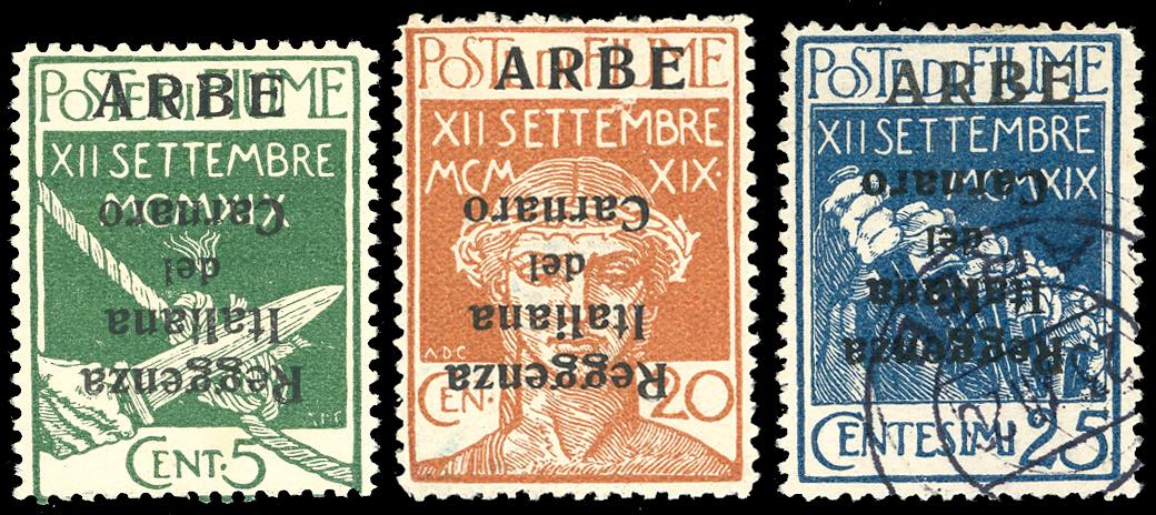1920 - 5 cent., 20 cent. e 25 cent. soprastampati in caratteri grandi, soprastampa "Reggenza Italiana del Carnaro" capovolta (1aa,3aa,4aa), gomma originale per i primi due, il terzo usato, perfetti. Raybaudi per tutti, con cert. per il 25 cent.