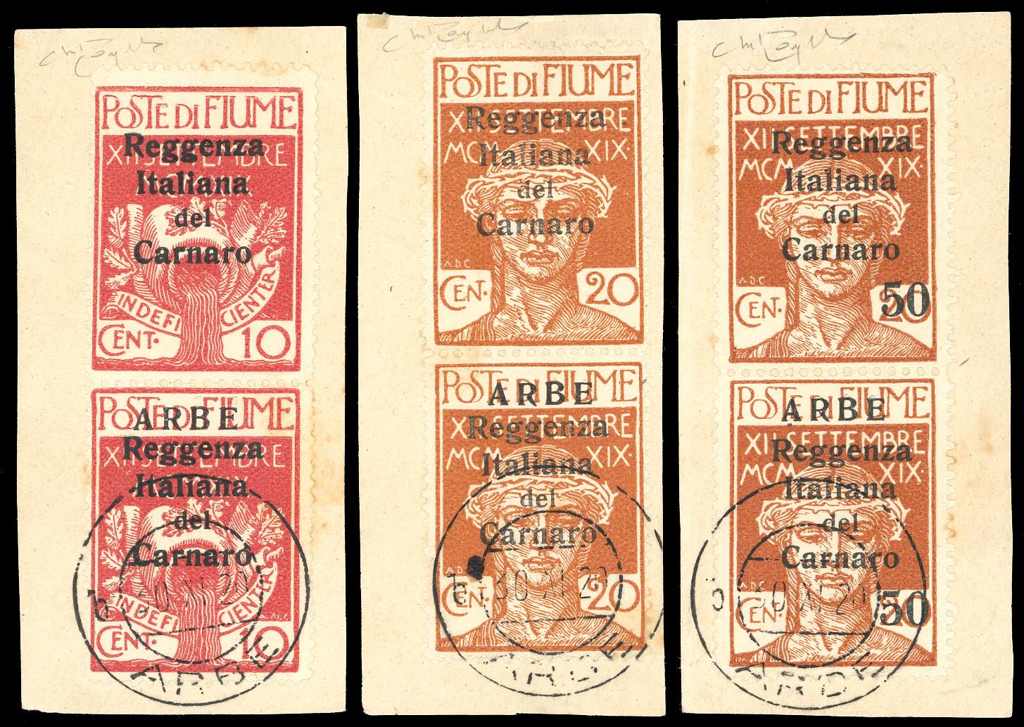 1920 - 10 cent., 20 cent., 50 cent. su 20 cent. soprastampati in caratteri piccoli, coppie verticali con l'esemplare superiore senza la soprastampa "ARBE" (6h,7h,9h), perfette, usate su frammento. Cert. Raybaudi.
