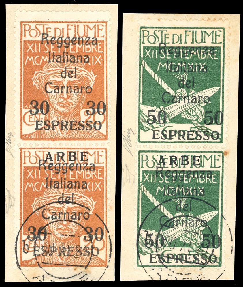 1920 - Soprastampati, coppie verticali con l'esemplare superiore senza la soprastampa "ARBE", serie completa (1b/2b), usate su frammento, ... Leggi tutto